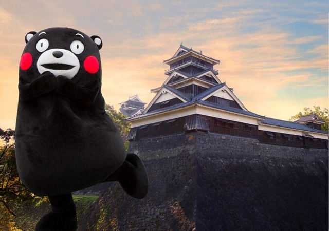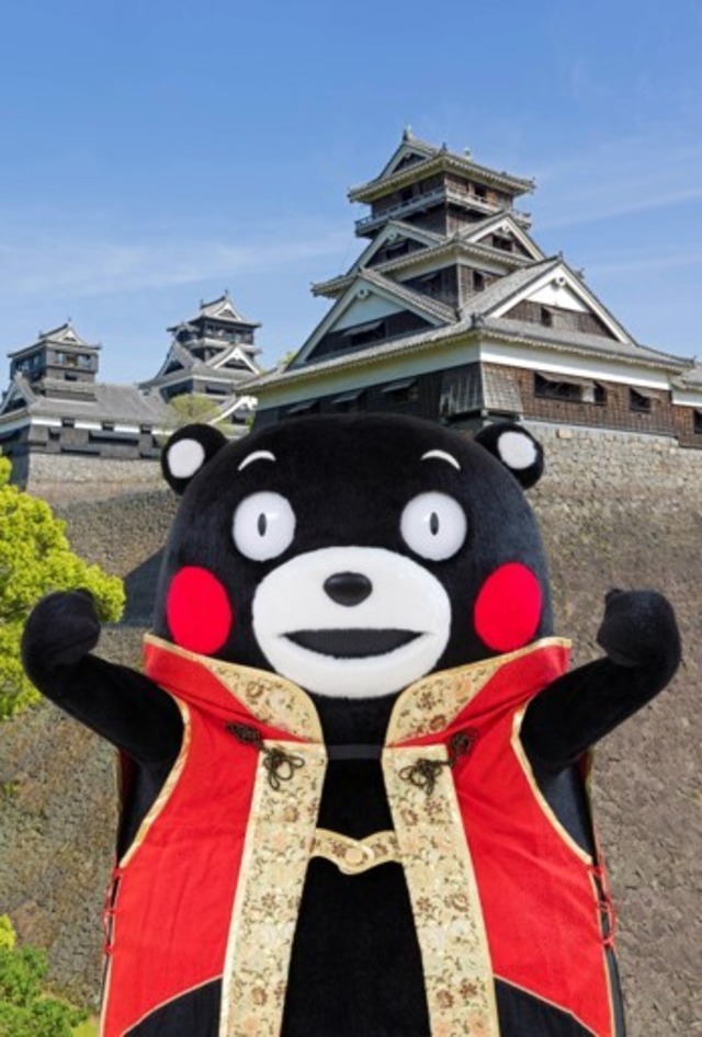カッコいい清正の衣装を纏ったくまモンと熊本城です